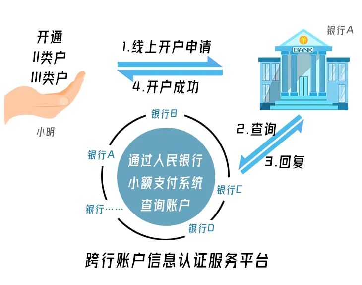 舉個例子,小明要在線上開立II、III類賬戶,可以通過手機銀行發(fā)送線上申請,開戶行收到申請后,通過跨行賬戶信息認(rèn)證服務(wù)平臺,向被查詢行進行五要素驗證,通過驗證即可完成開立賬戶。